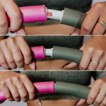 1) Koło Hula hop składamy poprzez umieszczenie białej końcówki wraz z jednoczesnym wciśnięciem czerwonego przycisku w otwór kolejnego elementu hula hopu. Kolejne części umieszczamy analogicznie aż do utworzenia pełnego koła.